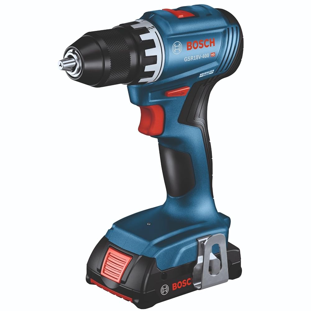 The Bosch GSR18V-400B22 18V Compact Brushless 1/2 In. Drill/Driver Kit features a drill with a brushless motor for efficient power and outstanding runtime. It delivers up to 400 In.-Lbs. of max torque with a head-length of only 6.3 In. for an outstanding power-to-size ratio. This compact tool is handy for overhead applications, while delivering pro dependability on the jobsite. The brushless motor delivers longer runtime and lifetime compared to brushed models. The drill has 20 clutch settings, to match the force to the task at hand. The drill also features variable speed, which controls operating speed for precise tool performance. Its all-metal chuck provides first-rate bit retention. Also included in the kit are a belt clip, two 2 Ah Standard Batteries, an 18V charger and a carrying bag.