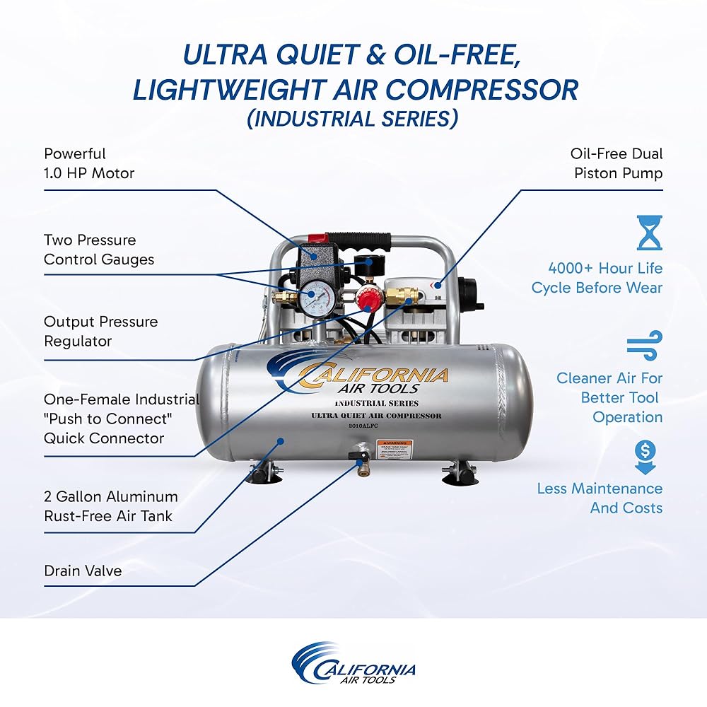 The CALIFORNIA AIR TOOLS 2010A Ultra Quiet & Oil-Free Air Compressor is designed to be one of the quietest air compressors in the industry having only 60 decibels of sound. The powerful 1.0 HP (SP-9413) motor operates at only 1680 RPM creating less noise and less wear. The “New” SP Series of Ultra Quiet Air Compressor Motors have been designed to increase duty cycle and allow for longer continuous run times. The Oil-Free Dual Piston Pump System is engineered for high performance and durability. The CAT-2010A Air Compressor has a Oil-Free Dual Piston pump designed to have a life cycle before wear of 3000 Plus hours compared to other comparable air compressors with life cycles of 500 hours or less. The Oil-Free pump allows for use in a variety of temperatures and uneven terrains. The 2.0 Gallon Aluminum (Rust-Free) Air Tank is Lightweight (35 lbs.) and very easy to transport. This air compressor is ideal for anyone working inside where noise is a major issue.