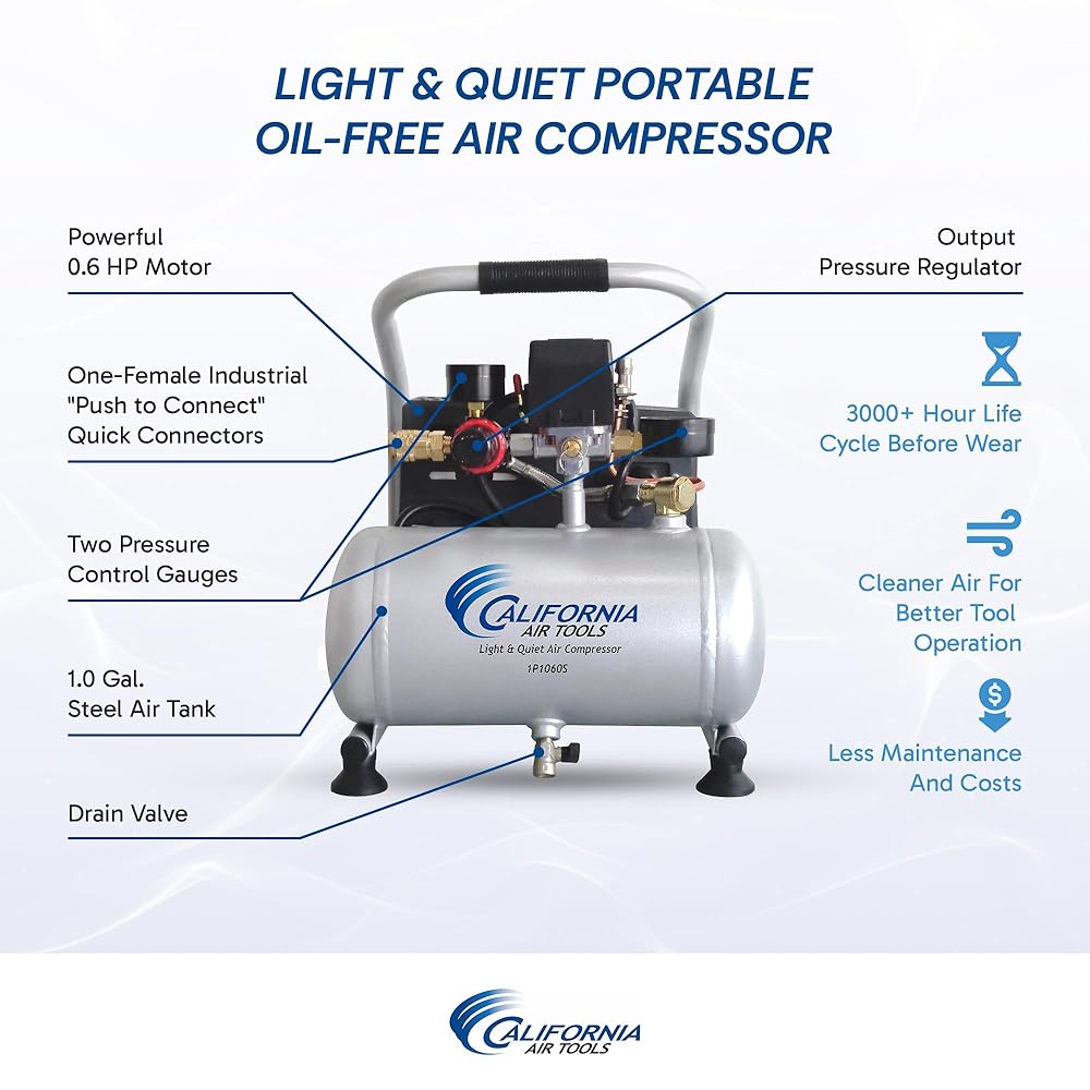 California Air Tools CAT-1P1060S Light & Quiet Portable Air Compressor, Lightweight, Ultra Quiet, Oil-Free, 1 Gallon Steel Tank, .6 HP, 56 dBA Noise Level, Silver