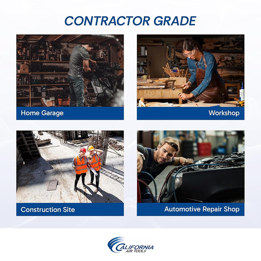 The California Air Tools Light & Quiet Air Compressor redefines high-performance air compressors with a remarkably low noise level of just 56 decibels, making this super quiet air compressor perfect for indoor use where quiet operation is crucial. Powered by a .6 HP motor running at 1680 RPM, this oilless air compressor offers reduced wear and significantly quieter performance. Designed with an oil-free Dual Piston Pump System, it delivers exceptional durability, with a life cycle of over 3000 hours before wear, requiring minimal maintenance. This versatile oil-free air compressor performs reliably in various climates and terrains, offering consistent power for diverse projects. Weighing only 29 pounds, this lightweight air compressoris easy to move and position. Ideal for staple guns, brad nailers, airbrushes, and blow guns, it’s also perfect for household tasks like inflating tires and cleaning. At California Air Tools, we specialize in innovative, user-friendly compressors that balance power and quiet operation. The Light & Quiet Air Compressor enhances your workspace with its superior performance and near-silent operation, designed for both professionals and hobbyists.