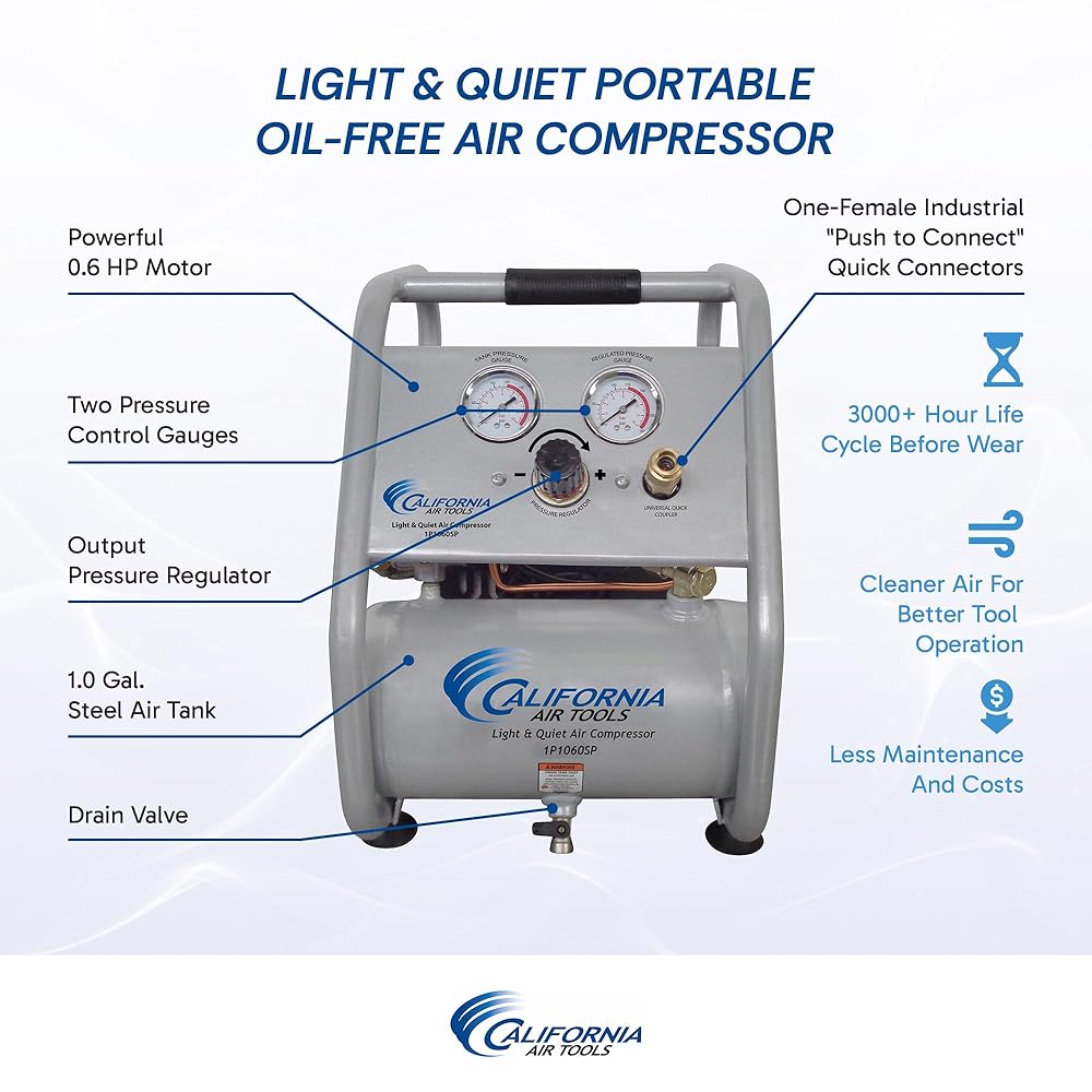 The California Air Tools light and quiet 1P1060SP portable air compressor is designed to be one of the quietest air compressors in the industry at only 56 db of sound. The 1.2 HP motor operates at only 1680 RPM, creating less noise and less wear. The updated in.Ip in. Ultra Quiet and oil-free motor is a single Piston pump design engineered for high performance and durability. The 1.0 GAL. Steel Air tank is lightweight (34 lbs.), making it very easy to transport. This compressor has an oil-free single Piston pump designed to have a life cycle before wear of 3000 Plus hours compared to other comparable air compressors with life cycles of 250 hours or less. The oil-free pump allows for use in a variety of different temperatures (cold) and uneven terrains. The 1P1060SP produces 1.2 CFM at 90 PSI, allowing you to use staple guns, brad nail guns, finish Nail guns, nail guns, airbrushes and blow guns. It’s great for the garage and perfect for cleaning or inflating tires, beds, toys and sport balls. Its quiet design is ideal for anyone working inside where noise is a major issue.