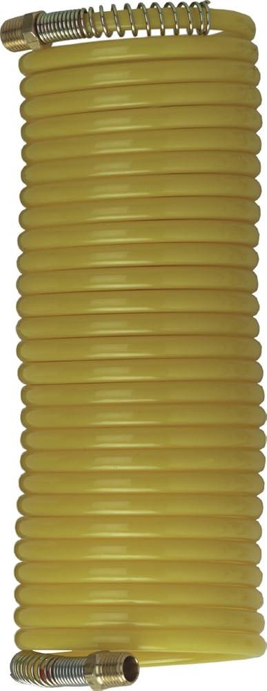 1/4″ x 25′, Nylon Recoil Hose, 200 PSI Max Working Pressure, 35 Degrees Working Temperature up to 250 Degrees Fahrenheit, 1/4″ NPT Male Fittings, Shrink and Kink Proof , chemical and corrosion resistant, Includes brass fittings and spring guards.