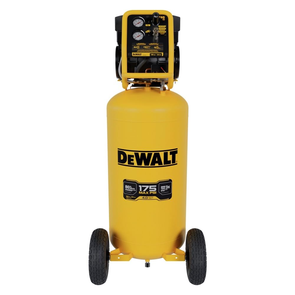 The DEWALT 26 Gallon Quiet Air Compressor (DXCMSAC260) delivers 4.0 SCFM at 90 psi with a noise level of 65 dBA. This air compressor has big capacity and power yet it is 80% quieter than standard oil free air compressors. It is powerful enough for the toughest grease gun, drills, hammer, finish nailer, framing nailer, impact wrench, ratchet and spray gun projects. The roll cage design protects all vital components while the conveniently located control panel puts your gauges, regulator and quick connect at your fingertips. These combined features along with the 10 inch heavy-duty pneumatic wheels provide added mobility and easy storage around the shop, garage or on a worksite.