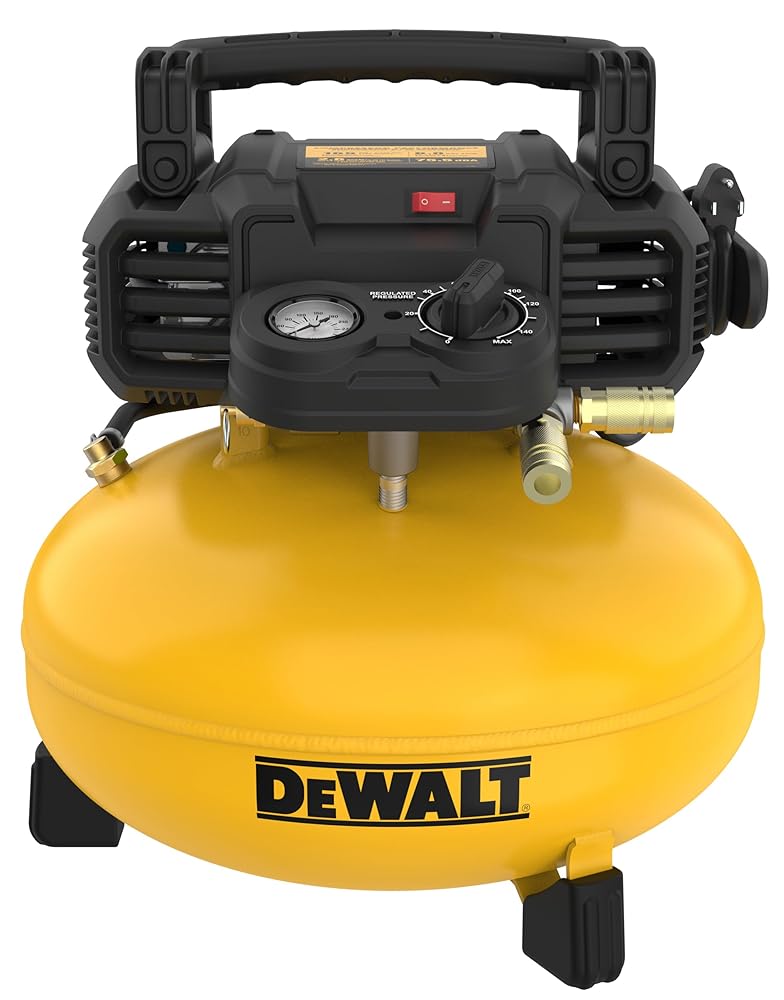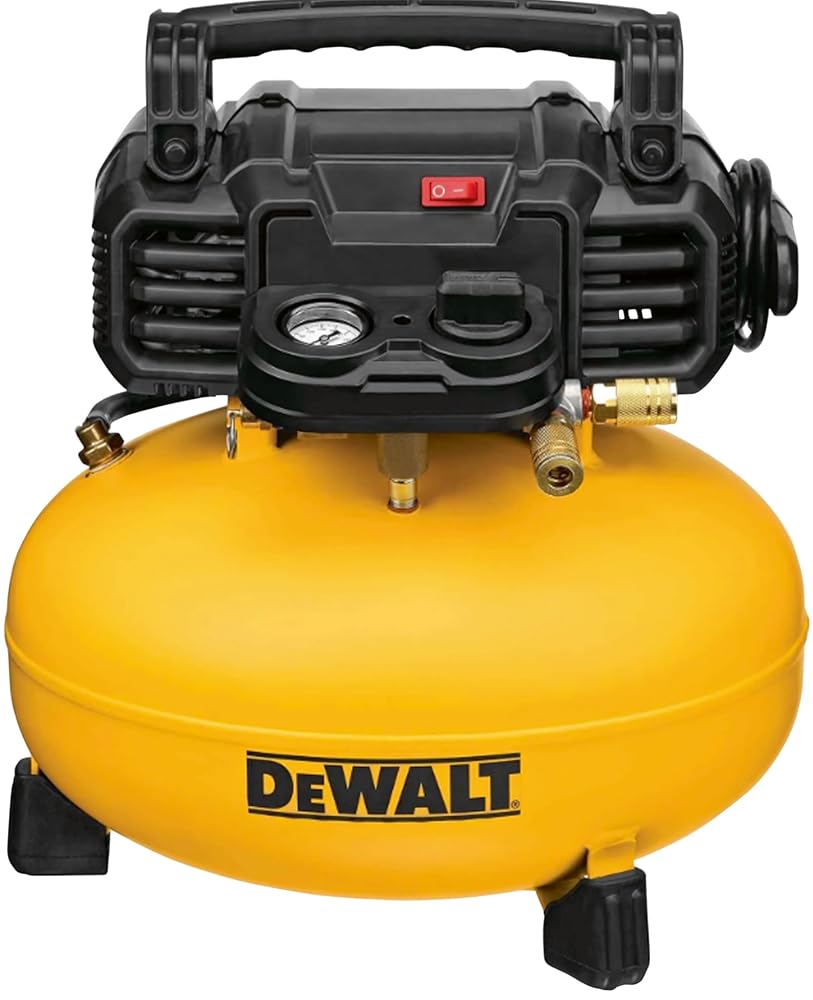 The DEWALT Brad Nailer & 6 Gallon Pancake Air Compressor Combo Kit delivers the jobsite-proven performance professional contractors demand. The DXCM55126 compressor provides 165 Max PSI and 2.6 CFM @ 90 PSI, giving you the industrial-grade airflow needed for longer runtime between cycles with quick recovery. The 1-Turn Regulator enables quick and accurate pressure adjustments without wasting time. With two factory-installed quick couplers, you’ll keep multiple tools ready for action. The compressor features a rugged yet lightweight 30 lb. design with integrated handle strikes the perfect balance between DEWALT’s signature durability and mobility on job sites. The included DWFP12231 18 Ga. Brad Nailer drives 5/8″ – 2″ (15-50mm) brads with precision and features a long-life, oil-free design for reliable daily performance. Tool-free depth of drive adjustment allows precise setting of nails, while the tool-free jam release, rear exhaust, and professional-grade magnesium body deliver the tough, dependable features contractors expect from DEWALT. The non-marring tip protects work surfaces and is removable with on-tool storage for added convenience.