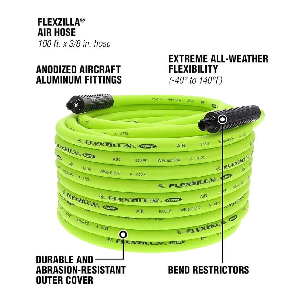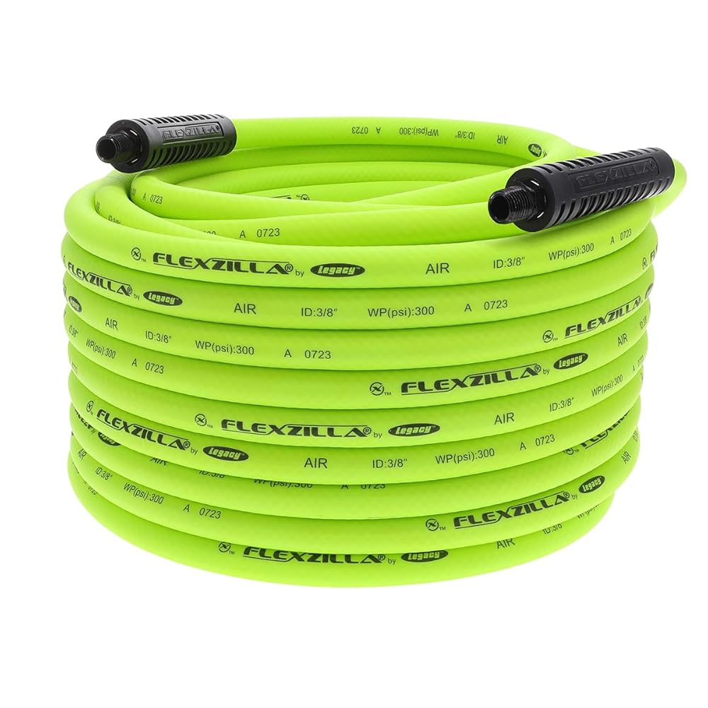 Flexzilla Air Hose, 3/8 in. x 100 ft., 1/4 in. MNPT Fittings, Heavy Duty, Lightweight, Hybrid, ZillaGreen – HFZ38100YW2