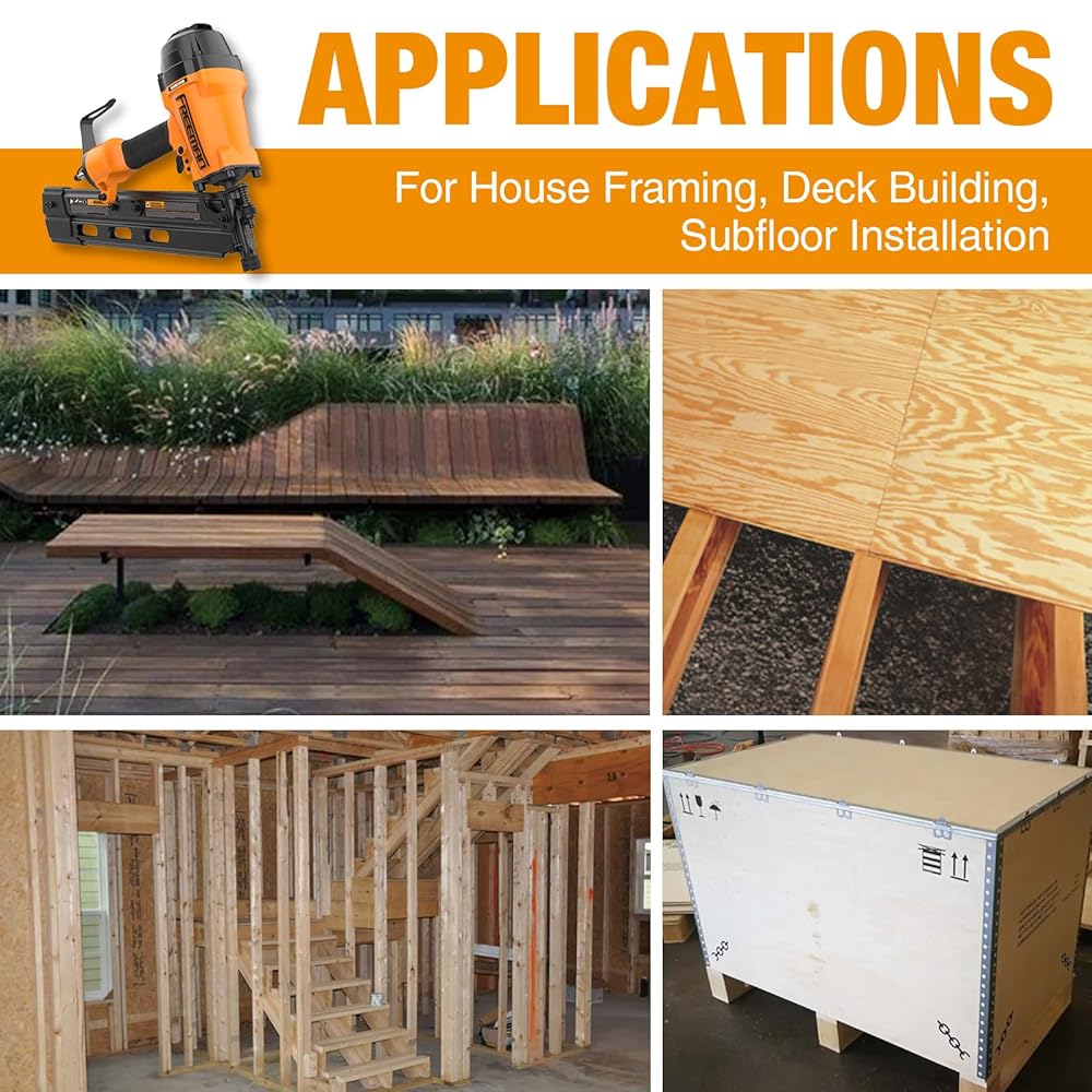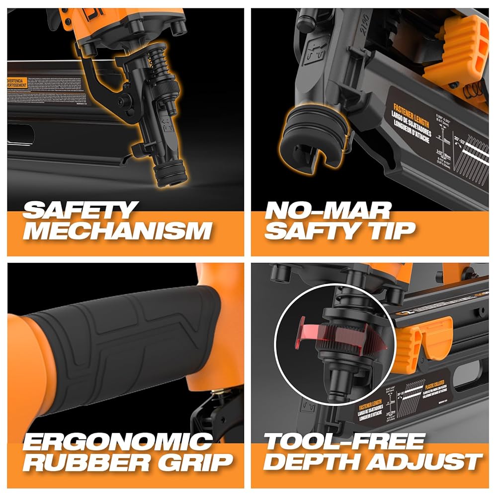 - Compatible Nails: Accepts 21° plastic collated full round head framing nails from 2″ to 3-1/2″, 0.113″ – 0.131″ diameter