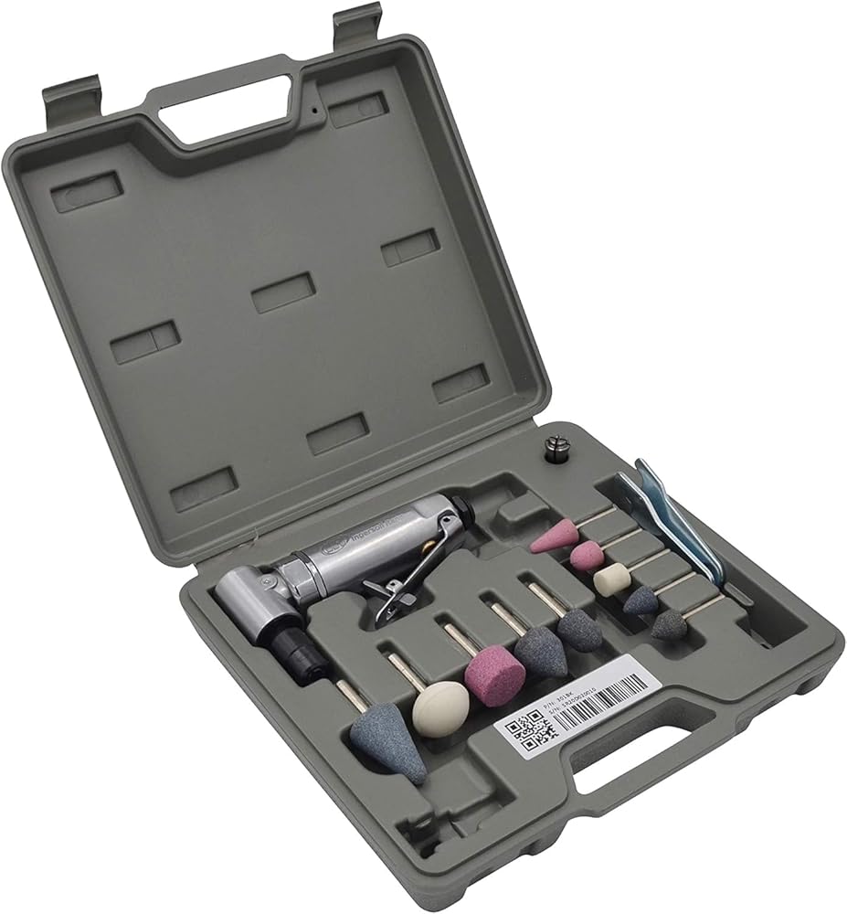 As part of an expanded line of long-lasting, economical, general purpose grinders, the 301B delivers a number of beneficial features in one compact package. Right-angle configuration provides easy access to tight spots, so you can grind, break sharp edges, de-burr, port, and polish virtually anywhere! Kit includes 10 mounted grinding tips and a Blow-molded case.