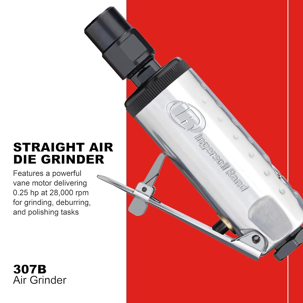 - POWERFUL AIR GRINDER: Invest in quality with the Ingersoll Rand 307B straight-angle Air Die Grinder. This grinder tool boasts a powerful vane motor delivering 0.25 hp at 28,000 rpm. It’s ideal for grinding, deburring, and polishing tasks.