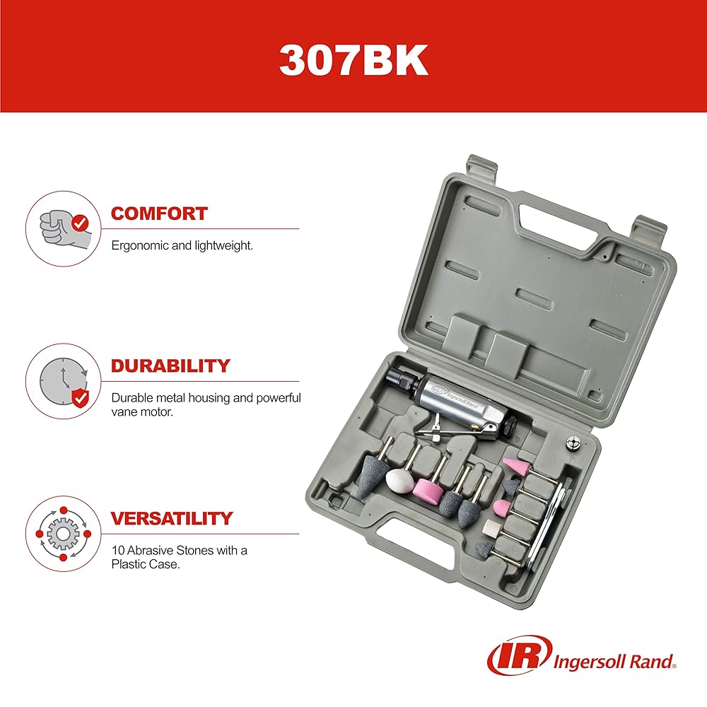 Ingersoll Rand’s 307B general purpose Air Die Grinder is durable, reliable, and cost-effective. Designed for porting, light weld grinding, smoothing sharp edges, de-burring, and polishing. Their compact design offers exceptional maneuverability, versatility, and accessibility for difficult-to-reach spots. Kit includes 10 mounted grinding tips and a blow-molded case.