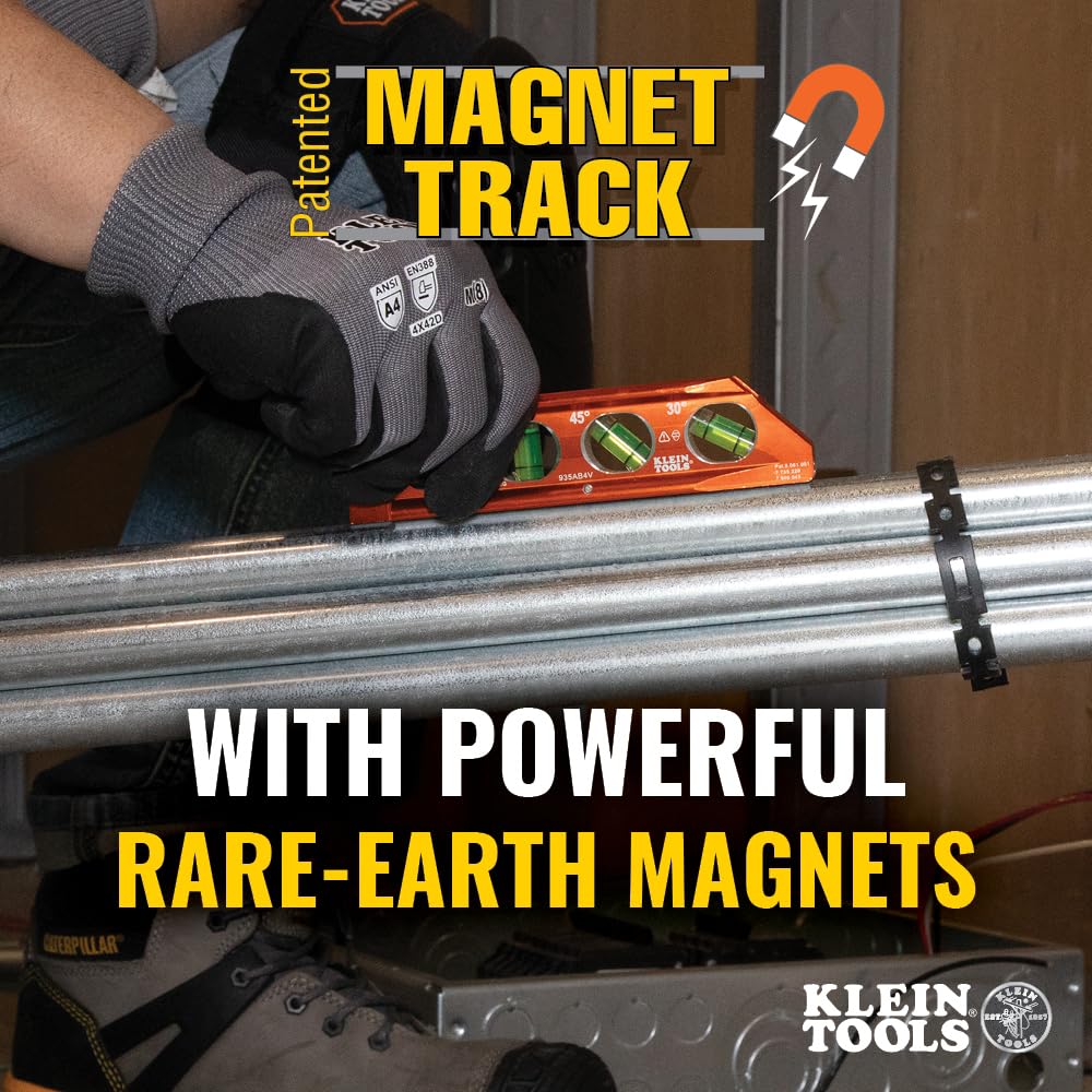 The Klein Tools 6.25-Inch Accu-Bend Aluminum Billet level is designed for effective leveling on and off the construction site. The patented Magnet Track keeps the powerful Rare-Earth magnets secure and ensures that they won’t fall out. This leveler also includes large, easy-to-read vials and vial windows for easy viewing at any angle. The thumb screw allows for quick attachment to the ends of conduit and pipe while bending. The V-groove fits snugly into pillars, posts, conduit, pipe, and any other round surface. The tapered nose slides into pockets and corners. Whether you’re a carpenter, electrician, plumber, drywall installer, DIY enthusiast, or professional tradesperson, the Klein Tools Cat. No. 935AB4V can help make your leveling tasks easier.