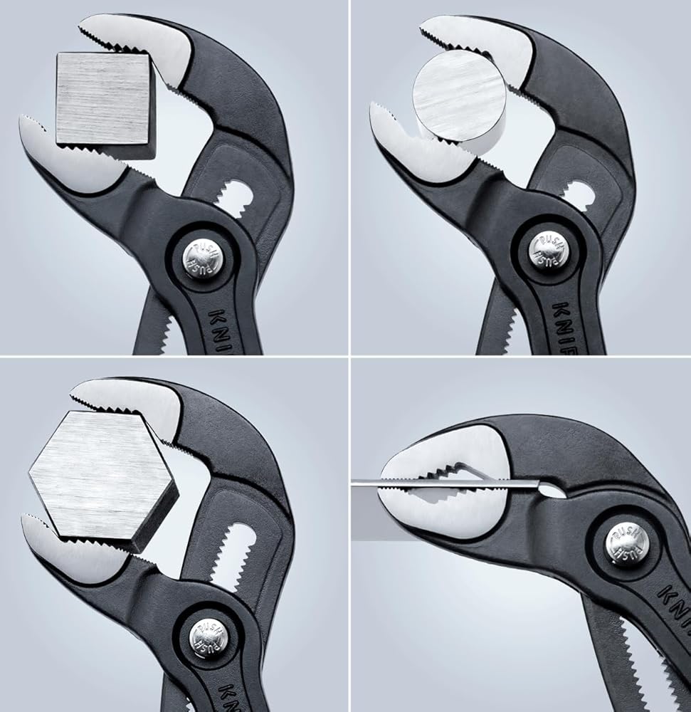 Fast adjustment directly on the work piece eliminates time-consuming test adjusting of the correct opening size. Just position the upper jaw to the work piece, push button on pliers and move close the lower jaw. Once adjusted the pliers self-lock on pipes and nuts with no slipping. Optimized shape jaw will grip round, square and hex shaped material. The box joint design provides high stability because of the double guide.