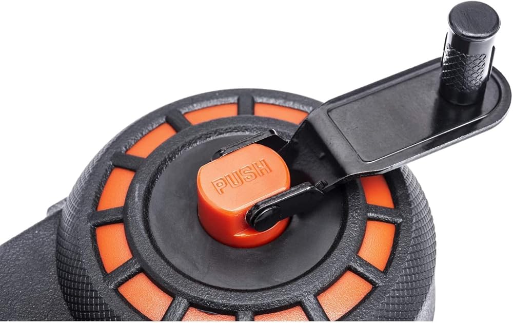 - Fold-away handle locks the retrieval arm in place to prevent breaking or inadvertent unreeling