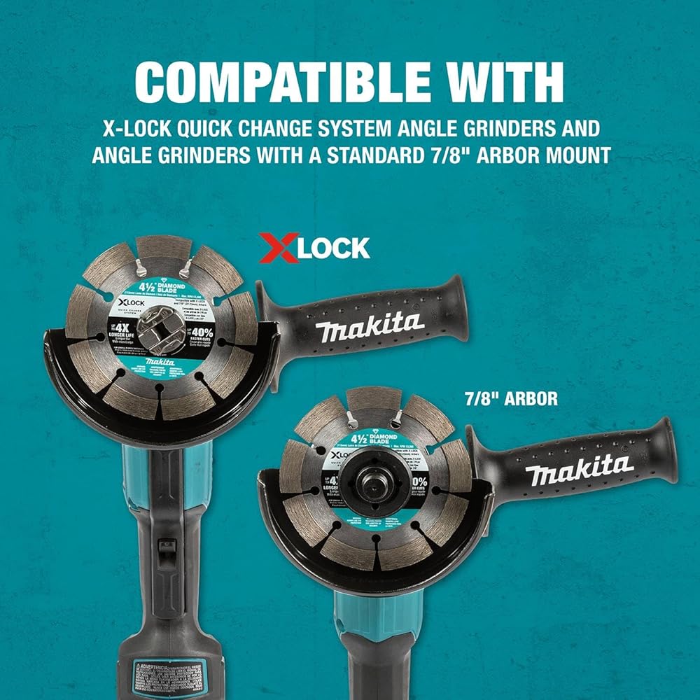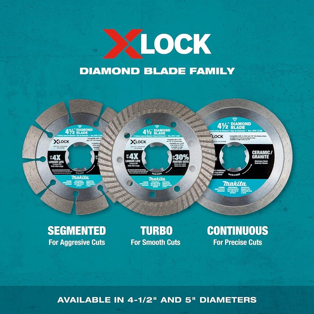 The X-LOCK Quick Change System provides up to 5X faster blade changes. The X-LOCK 4-1/2” Turbo Rim Diamond Blade (E-07222) is designed for masonry cutting, including concrete, block, brick, pavers, and roof tiles. It is made with high-quality diamonds, carefully tensioned for less vibration, and features a turbo rim for faster and smoother cutting. The blade can be used for dry or wet cutting. X-LOCK quick change system also allows for easy tool-free blade changes by simply pulling the release lever on Makita® X-LOCK Angle Grinders (sold separately).