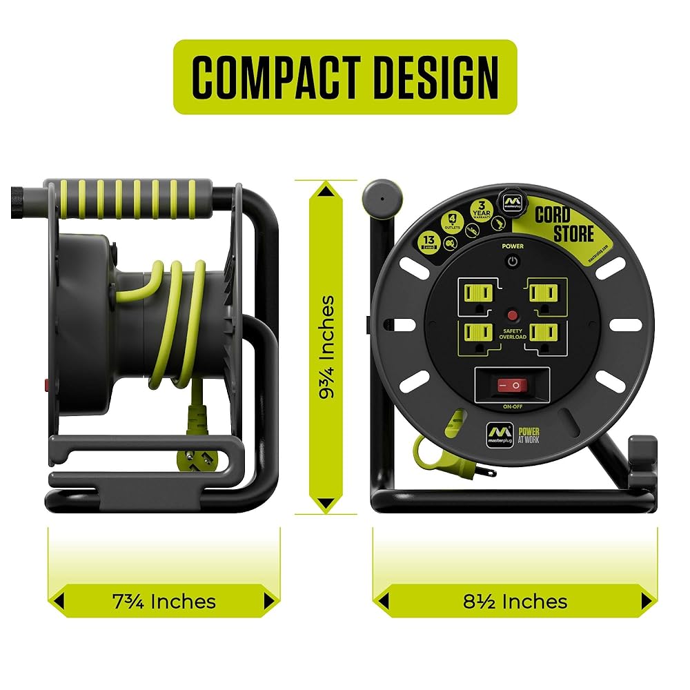 - 3FT EXTENSION CORD REEL: have power where you need it with Masterplug Cable Reels, 4 shuttered power outlets, LED indicator, integrated power switch and safety overload circuit breaker protects against power overloading, for a safe easy-to-use portable power solution