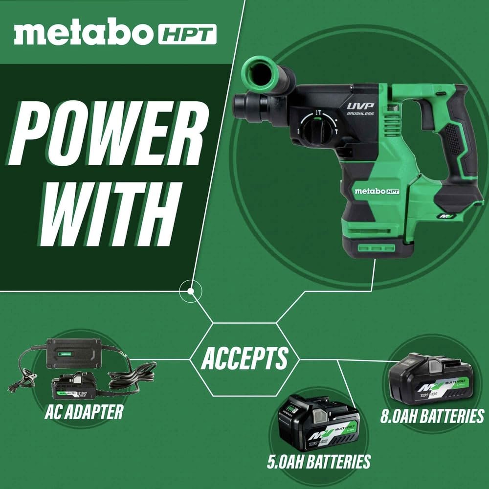 The 36V MultiVolt Brushless 1-1/8″ SDS Plus Rotary Hammer with UVP model – DH3628DAQ4 (tool body only) offers corded performance with the convenience and versatility of a cordless tool. GO all day with less fatigue as its reduced weight design and added User Vibration Protection (UVP) makes drilling easier. Work more efficiently with the auto stop feature that allows for set times when drilling repetitively. Control the power with its two-speed setting functions. Work safely as the Reactive Force Control (RFC) stops the motor before the entire tool jerks if the tool bit is suddenly overburdened during operation. Use the LED level with a built in sensor that will detect the tilt of the tool and indicate when straight for precising drilling. This results in less time and money being spent adjusting skewed anchor bolts or re-drilling anchors. Work cleaner and safer with the optional dust extractor (#379135M). The DH3628DAQ4 36V Brushless Cordless 1-1/8″ SDS Plus Rotary Hammer is part of the expanding MultiVolt system of power tools from Metabo HPT. It accepts any MulitVolt battery for extreme power and runtime and can also accept the unique AC Adapter (ET36A) to plug in for all day runtime, offering ultimate versatility and power on the GO. Also available kitted – model DH3628DA.