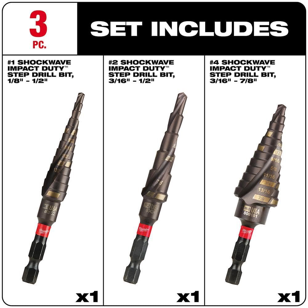 Our SHOCKWAVE Impact Duty Step Bits are engineered to deliver the most durable and fastest impact step bit hole drilling solution. Our step drill bits are made in the USA with global materials and give you best-in-class performance in impact drivers with the versatility to be used in drills. The 1/4 in. hex shank has an optimized SHOCKZONE body providing you with the industrys most durable shank, reducing early shank breaks. A Titanium Aluminum Nitride (TiAlN) coating helps deliver you 5x longer life, while the step drill bits Rapid Strike tip and dual spiral flute produce 2x faster holes. Includes: (1) Step Bit #1 1/8 – 1/2 in. (1) Step Bit #2 3/16 – 1/2 in. (1) Step Bit #4 3/16 – 7/8 in.