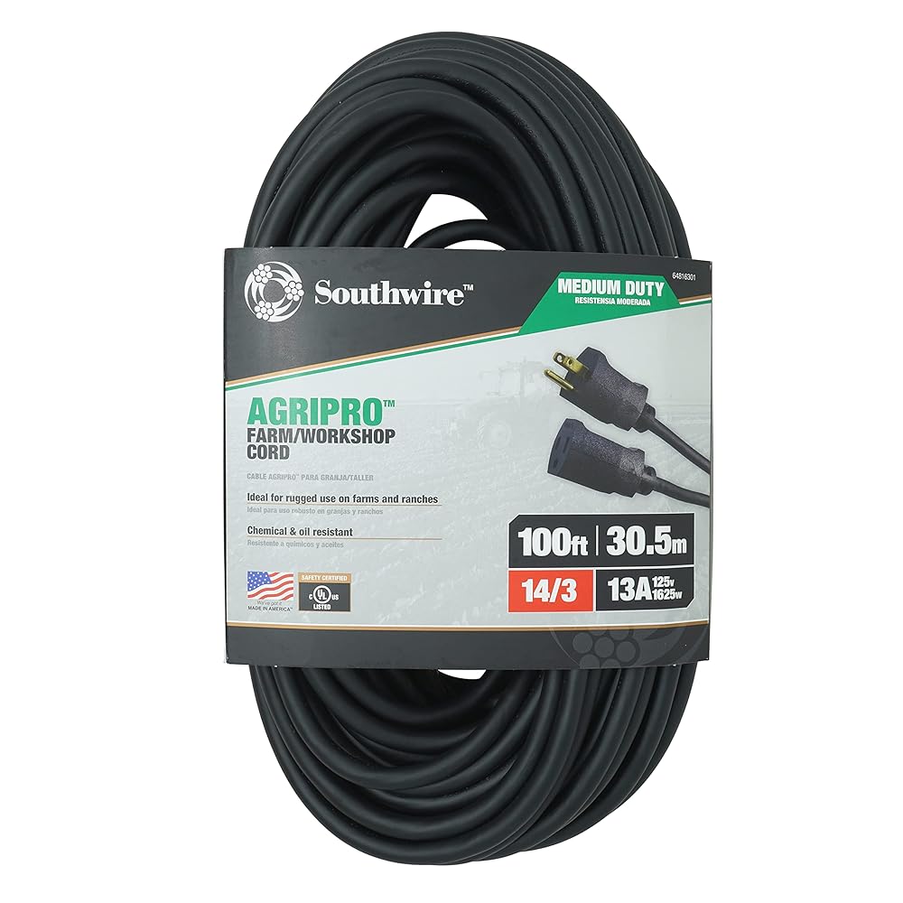 Southwire AGRIPRO Medium Duty Extension Cord, 100Ft, 14 Gauge, 3 Conductor, Farm/Workshop Cord, SJTOW, Black, 64816301
