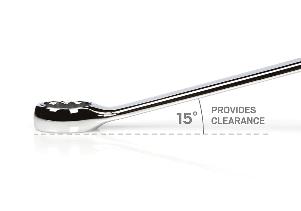 Each Tekton combination wrench is permanently marked with a stamped size marking on both sides for easy identification. The 12-point box end doubles the available access angles compared to a 6-point end. It is designed to contact and apply force to the sides of the fastener head rather than the corners, helping to prevent round-off. The 15-degree offset box end creates clearance for your fingers and makes it easier to reach around obstructions. To reduce the working swing arc in tight spaces, the open end is angled 15 degrees so the wrench can be flipped over with each rotation to engage the fastener twice as often.