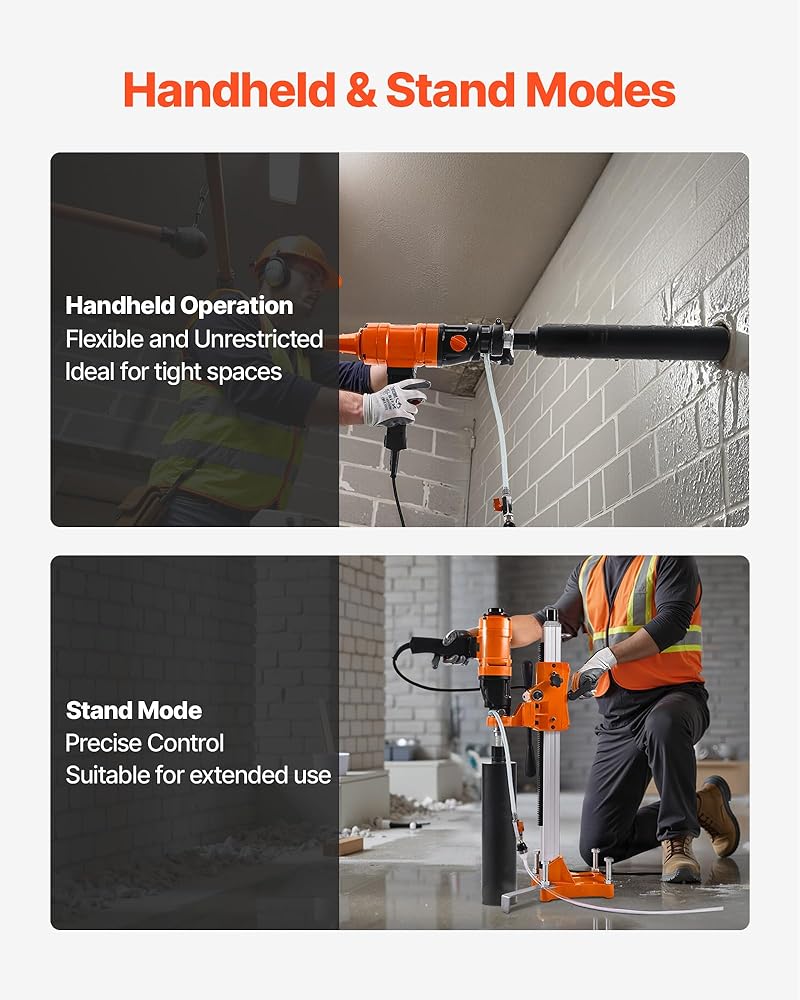VEVOR Diamond Core Drilling Machine, 8 in Drilling Diameter, 2-in-1 Handheld & Stand-Mount Dry and Wet Concrete Core Drill Rig with 4 Drill Bits, 1075/2300 RPM 2-Speed, for Concrete Brick Stone, 1800W